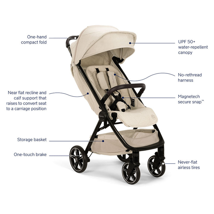 The TRVL lx Stroller by Nuna presents you with the compact freedom you need to get out and about, regardless of how near or far the journey leads. It’s designed to never weigh you down and has a one-handed fold that redefines what you’ve previously known about moving through your day with grace and ease. With its leveled-up wheel profile, you’re ready to navigate whatever the road ahead has in store.