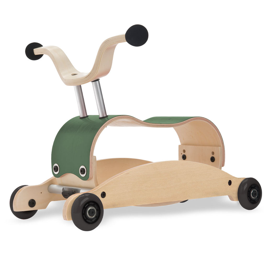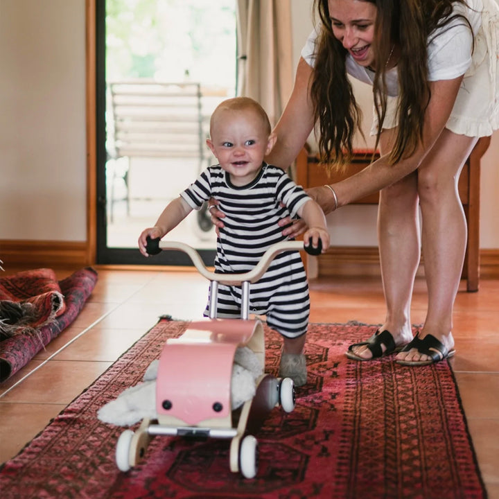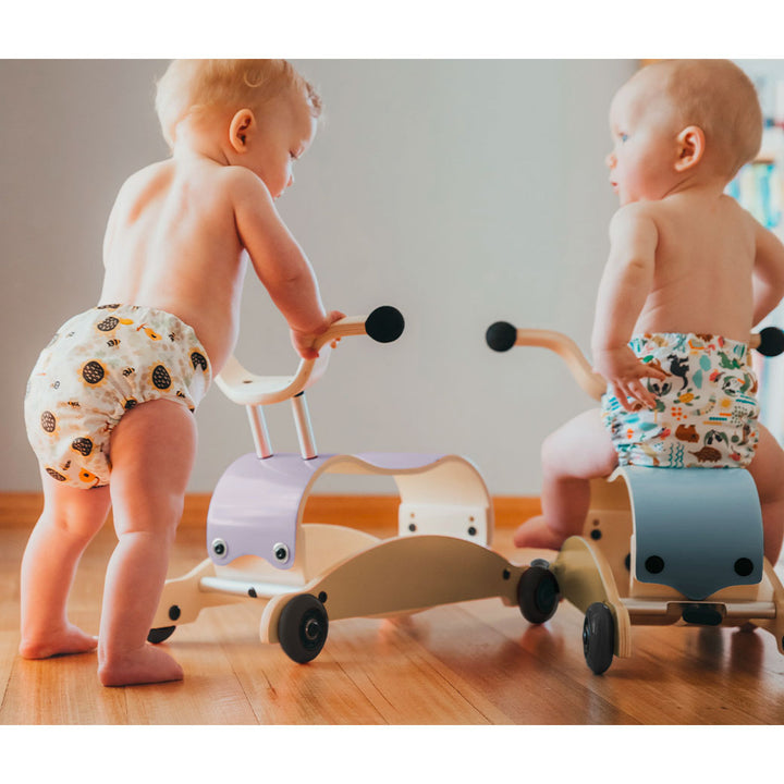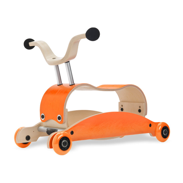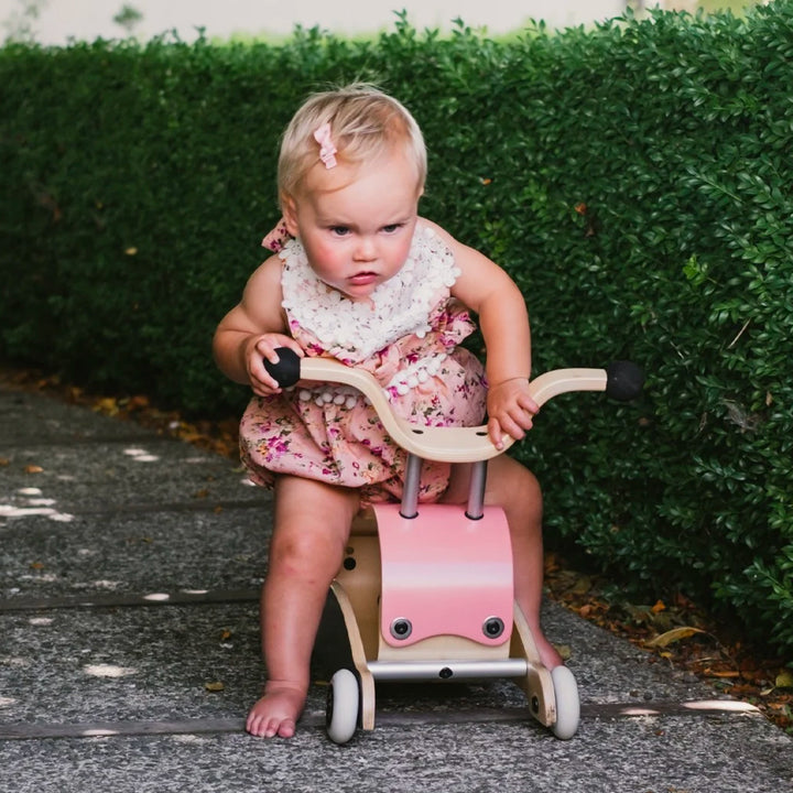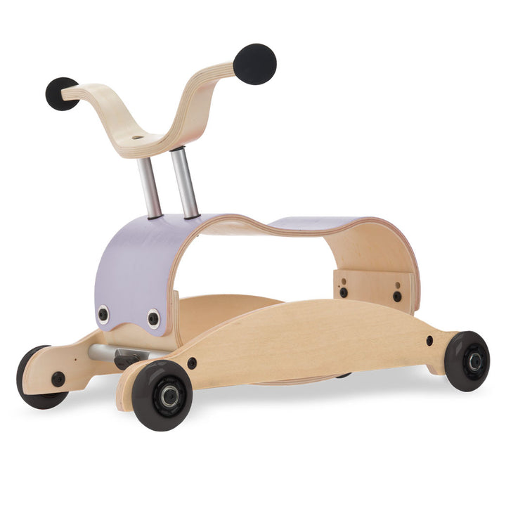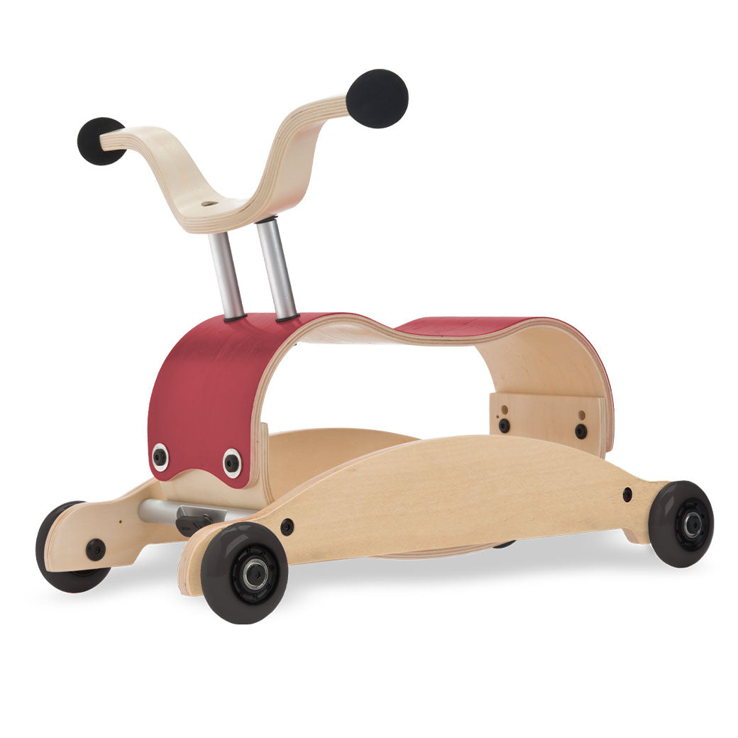 Wishbone Mini Flip: Walk. Rock. Ride. The Wishbone Mini Flip is an heirloom-quality, 3-in-1 baby walker, perfect for children from about 9 months to 3 years. While the Wishbone Flip is designed for children closer to walking age, the Mini-Flip is optimal for our smaller friends who are just learning to walk and then allows them to ride and roll around while peddling their feet, once older. With the innovative flipping mechanism, it transforms from rock to roll in seconds - With no tools required! It's so easy to "flip" that you can teach your toddler to do it themselves! The seat has two sets of bolt holes to adjust the height as your child grows, and Wishbone recommends adding some weight (like a brick or some books) inside the Mini Flip to add stability for the youngest riders.