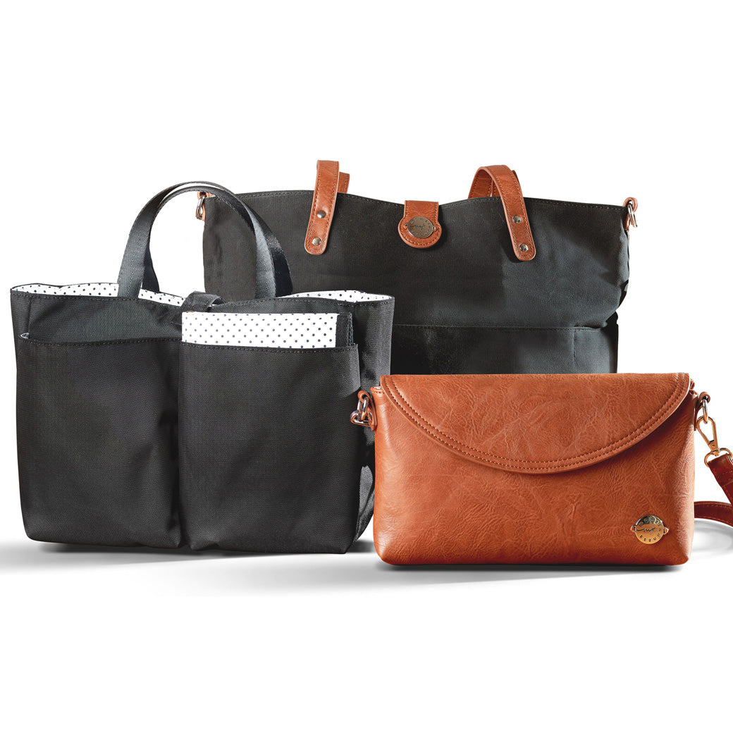 • Organizer insert, removable clutch and wipe-clean changing pad included