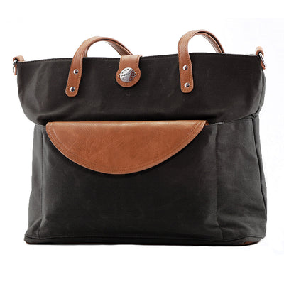 The Momkindness CarryAll Tote is made from premium vegan leather and waxed canvas, making it water-repellant and easy to wipe clean. The inside of the tote features a zip pocket and two slip pockets on one side, a large open pocket in the middle, and a padded protective laptop sleeve on the other side. The exterior features an extra large front pocket and three back pockets, one of which opens up at the bottom so you can attach your CarryAll Tote to your luggage when traveling!