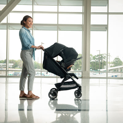 The Nuna TRVL stroller is ultra-lightweight at just 13.6 lbs.* so it’s easy to carry with the arm bar when folded or go hands-free and store away during travel with the carry bag that’s included. It pairs perfectly with all PIPA™ series car seats, creating a sleek-looking travel system with just a click – no adapters needed. Compact without compromise, city living or jet-setting parents will love the luxe materials and innovative conveniences of this compact and lightweight travel stroller for miles to go.