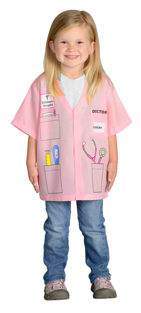 The doctor will see you now. This easy on shirt, made to look like doctor's scrubs, will make a preschooler ready to check his patients. Blue fabric printed with stethoscope, tongue depressor, syringe and other important tools of the trade. Pocket on chest for personalization. Ages 3-6.