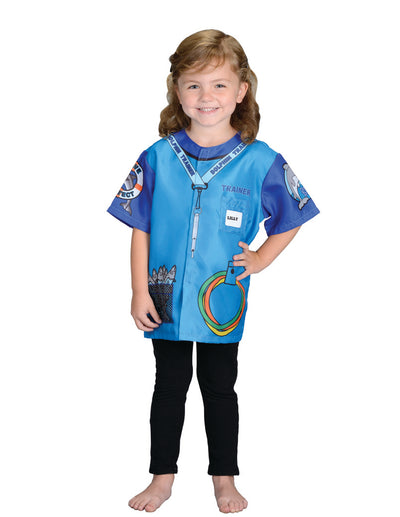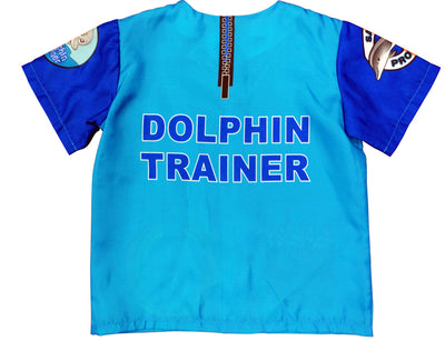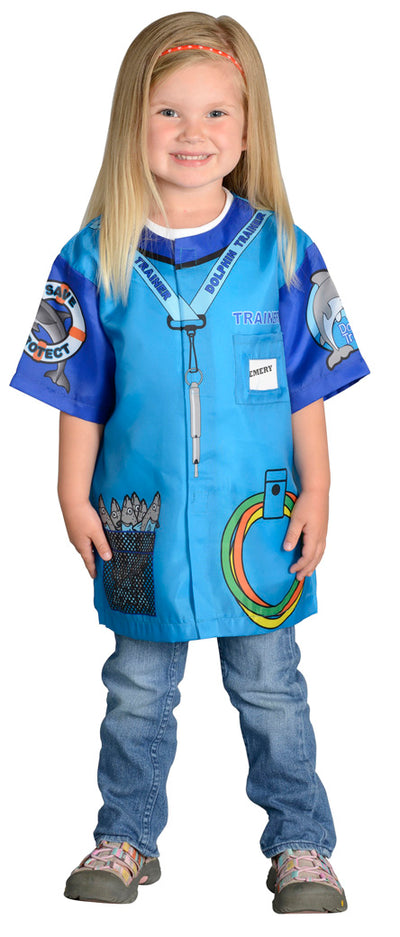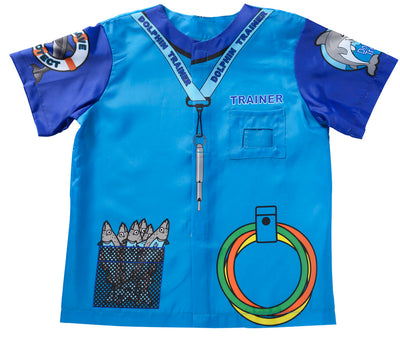 Make a Splash! Dress the part of a real life dolphin trainer. All the details are printed on this brightly colored blue shirt, right down to the rings for play and fish for feeding time. Pocket on chest for name badge makes this personal. Ages 3 - 6.