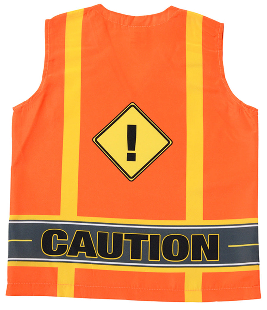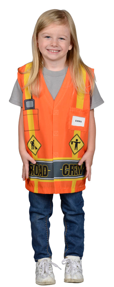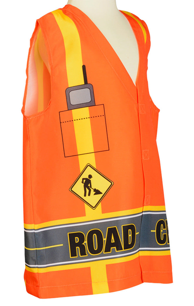 Kids look cool and comfortable with this realistic orange vest that can be spotted down the hall or around the block! Details include printed yellow road stripes, construction logos and cell phone graphic peeking out of a breast pocket. The bottom of the vest is adorned with the phrase “ROAD CREW” in large capital letters. Pocket on chest for personalization. Ages 3-6. Don't forget to pick up one of our great helmets to complete your look!