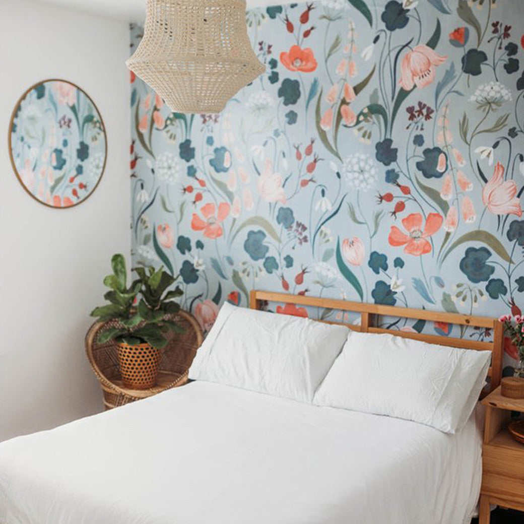 The beautiful blue whimsical floral design of the Anewall Blu Bell Mural adds a delicate look to your space. Designed by Kelsey Garrity Riley.