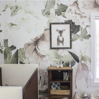 The Anewall Blush Floral Mural is perfect for creating a classic, feminine look in any room in your home. It's perfect for a bold nursery or an inviting sitting room - Honestly, we can't think of anywhere it wouldn't look great. It's perfect as an accent wall in an otherwise white room with some dark green and blush accents - We love it paired with dark wood furniture like in the pictures above!