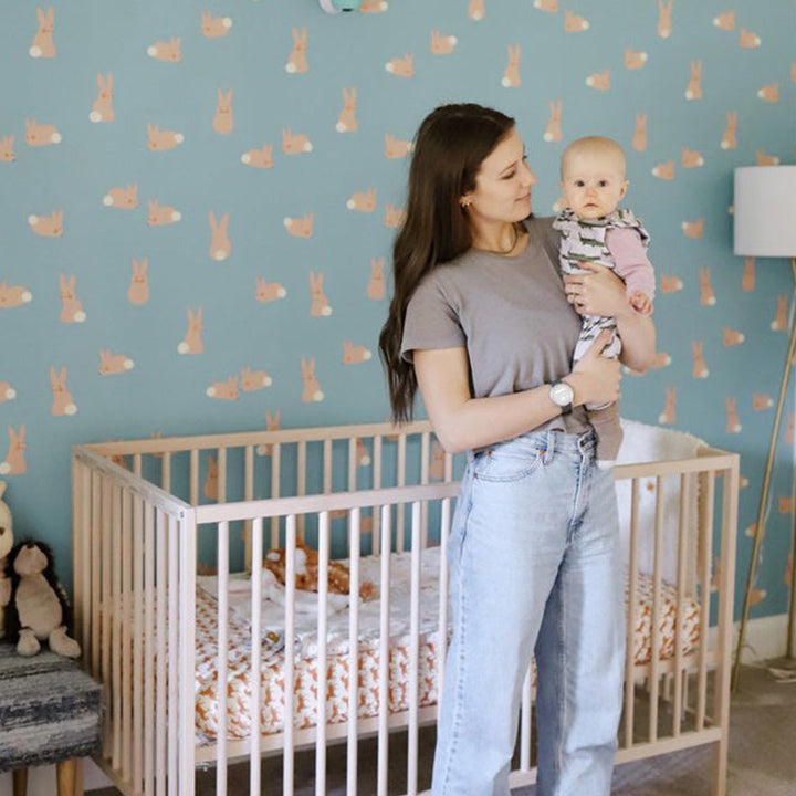 Classic storybook characters hop off the page and onto your walls with our Cottontail wallpaper! An adventurous pop of blue will color your walls while soft peachy bunnies keep your room feeling cozy. The Cottontail is the perfect addition to a bedroom or nursery to snuggle with your little one.
