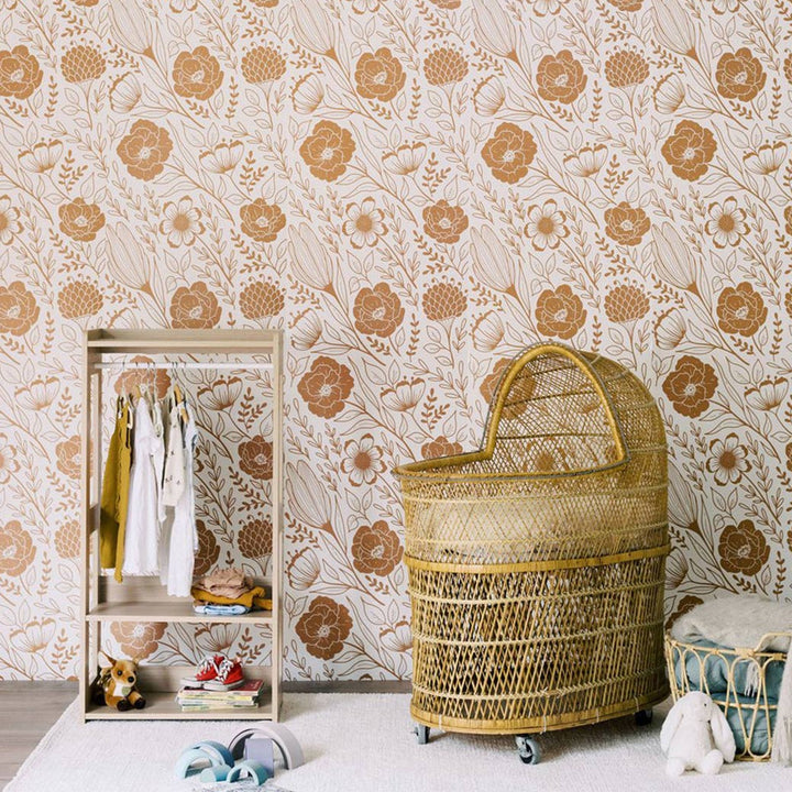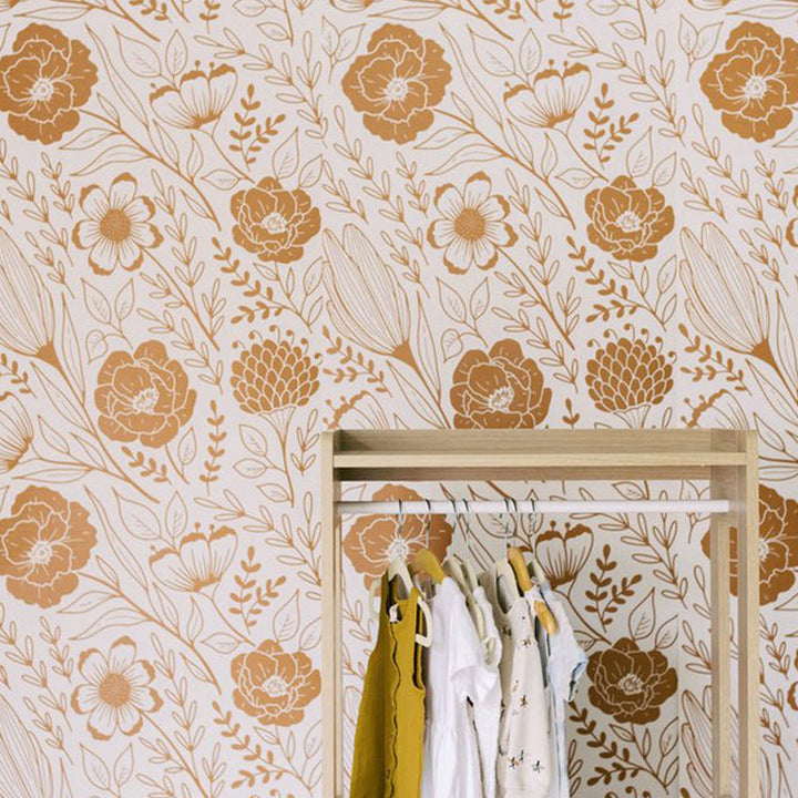 Golden and bold, this vintage floral design will bring pure joy to any wall in your home. Our bohemian and retro seeming wallpaper is perfect for a bohemian girls room, or seriously any accent wall. Looking to bring a little life to your walls? The Goldie is calling your name.