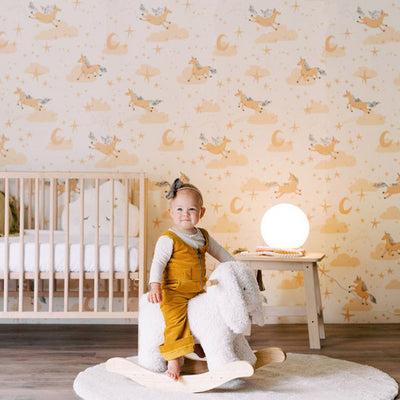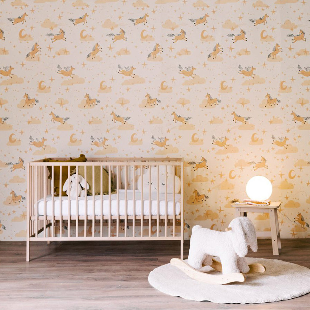 Bedtime stories come to life under an enchanting night sky. If you’re lucky, you may even catch a glimpse of a magical unicorn! This design pairs golden stars and moons with soft fluffy clouds. This wallpaper is sure to add the perfect touch that will keep your room twinkling into the night.