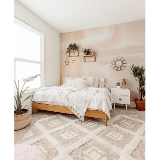The Tawny mural contains soft-hued pinks, faded purples, and warm oranges. This stunning mural is the perfect way to bring a pop of colour to a neutral space and bring a sense of serenity to your home.