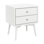 The Palma Nightstand by Babyletto is a sophisticated mid-century inspired design with tapered legs, brushed metal hardware, and two smooth-glide drawers. Easy setup with minimal assembly required.