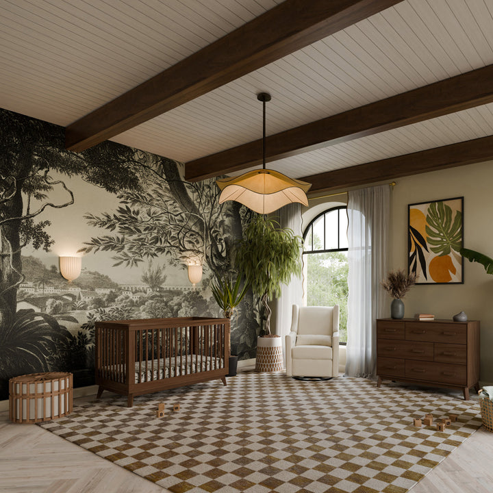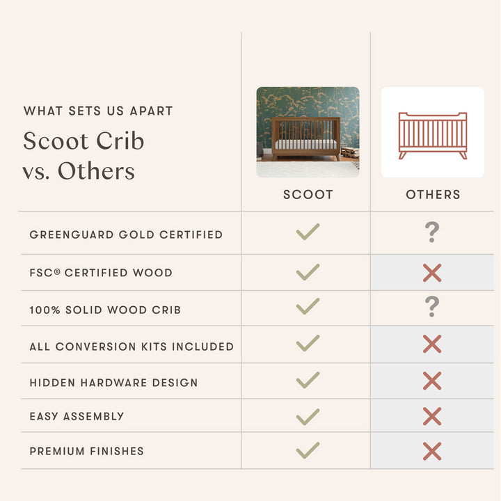 The Scoot 3-in-1 Convertible Crib is the perfect centerpiece to your mid-century modern nursery. Its retro-inspired features add a charming vibe for babe's new space. Modern and functional, an included toddler bed conversion kit allows you to seamlessly convert from crib to toddler bed to daybed as your babe grows. Breathe easy knowing the Scoot is made with solid New Zealand pine wood and is GREENGUARD GOLD certified making it a smart, safe, and stylish choice.