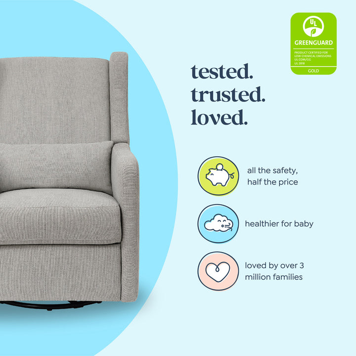 The daVinci Arlo Recliner and Swivel Glider has been thoughtfully designed to make feeding time comfortable and easy. Parents can rest easy in this soft and durable nursery chair that glides, swivels, and reclines to a peaceful resting position. Its water repellent & stain resistant fabric keeps this swivel glider looking beautiful through years of use. With its clean lines and wingback style, this timeless and versatile design can easily transition to your home in the later years.
