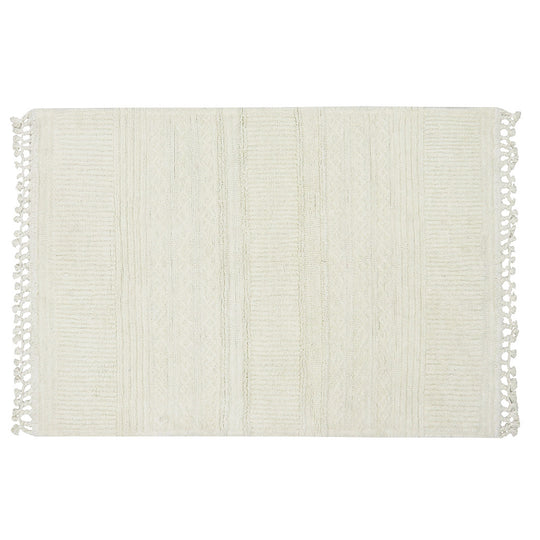 The Ari Sheep Woolable Rug by Lorena Canals brings together various tufting techniques to create a soft, multi-textured surface, combining vertical and horizontal lines with criss-cross lines that simulate braids, and playing with different pile heights. The Ari Sheep Woolable Rug by Lorena Canals is entirely Sheep White and finished at the edges with hand-twisted fringes.