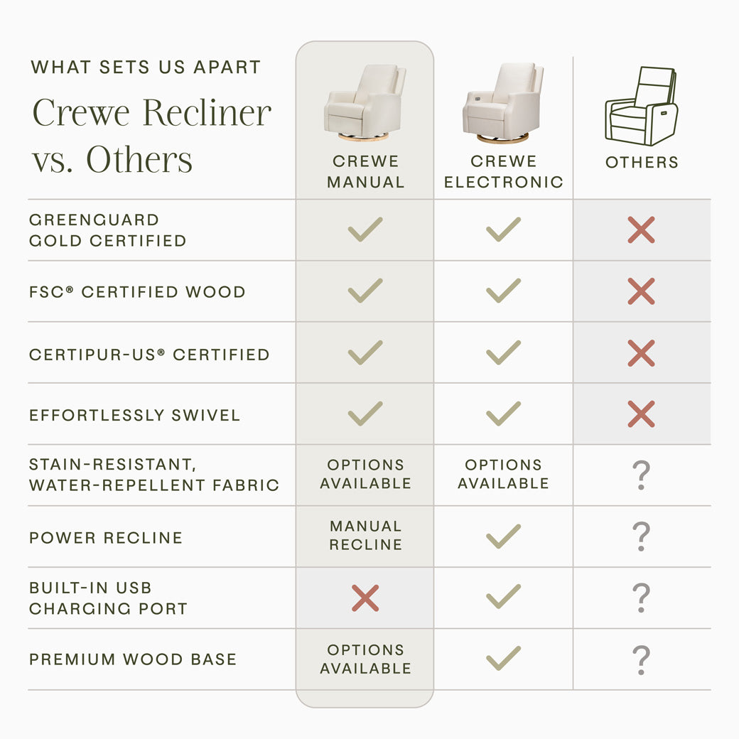 The Namesake Crewe Recliner & Swivel Glider blends form and function with its crisp, contemporary design and comfortable seat. Its smooth, back-and-forth gliding motion helps you rock your baby to sleep with ease, while the plush back cushion, hidden recline mechanism, and convenient swivel create an inviting repose for both you and your baby.
