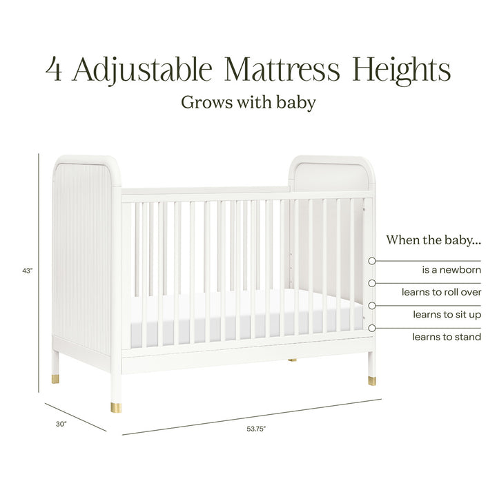 - GROWS WITH BABY: Namesake's cribs have 4 adjustable mattress positions to help transition as your baby grows and develops from newborn to toddler. Easily lower the mattress position as your baby begins to sit, pull up, and stand.