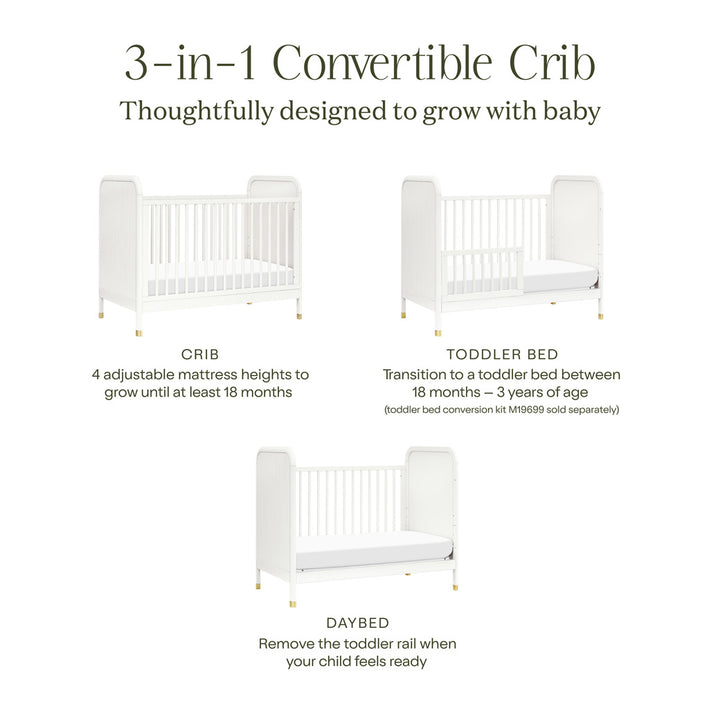 - 3-in-1 CONVERTIBILITY: Namesake's cribs adapt as your baby takes their first steps into toddlerhood. Designed to easily convert to a toddler bed and daybed. (toddler bed conversion kit sold separately)