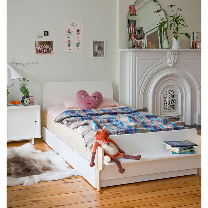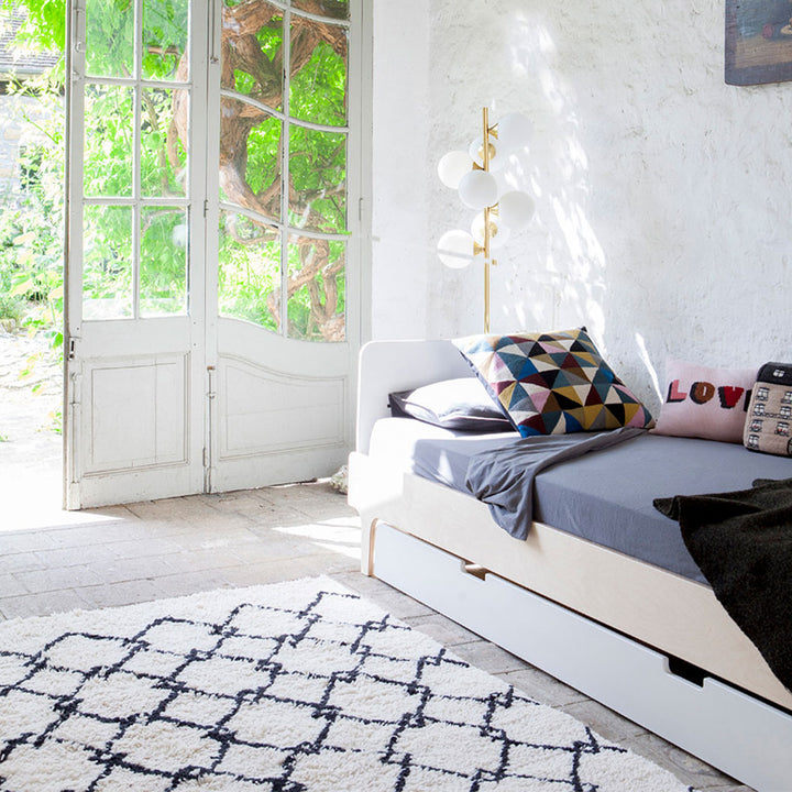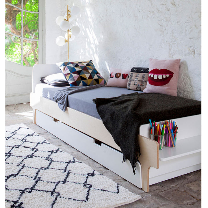 The River Bed Trundle by Oeuf is made especially for sleepovers, and doubles as extra storage under the bed for blankets and clothes when friends aren’t around. With the mattress (sold separately) the trundle makes an additional bed. Pairs only with the River Twin Bed.