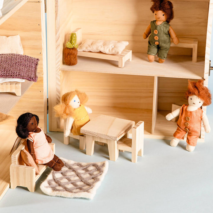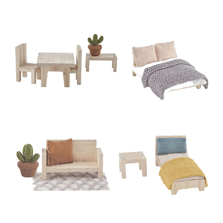 Everybody needs a cozy home where they can kick back and relax - even your little one's dolls! With the Furniture Set by Olli Ella, any doll will feel at home! Buying and organizing furniture is an important step, so your little one can participate and enjoy this process as well while decorating their dollhouse or play space! The Furniture Set by Olli Ella is made from timber, with linen and felt accessories that will make the play area come to life!
