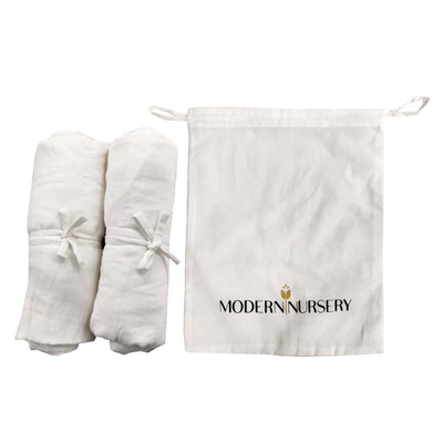 We are so excited to share our very own Modern Nursery organic crib sheets with you! We've been listening to your requests, thoughts and concerns over the years, and created a crib sheet worthy of our customers. Designed in-house with our littlest members of the Modern Nursery family in mind, these organic, double-layer muslin sheets are a small luxury every little one deserves to be surrounded with while they dream. We care about your baby's safety, so we've made them light and breathable; we also care about the parents, so we've put them in a pack of two so you always have a spare! Packaged in a reusable cotton drawstring bag, consider this bundle a gift of highest quality sleep for your babe.