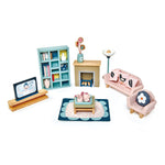 The Dolls House Kitchen Furniture by Tender Leaf Toys is a contemporary stylish kitchen set, with great attention to detail, Includes: island unit and 2 bar stools, A range style oven unit, fridge, butler sink unit, hand towel, kettle, fish pot, coffee machine with cups, 2 plates, recipe books, baguette on a chopping board, and a tray of freshly baked muffins. The Dolls House Kitchen Furniture by Tender Leaf Toys is suitable for all the wooden doll houses, as scaled to 1:12.