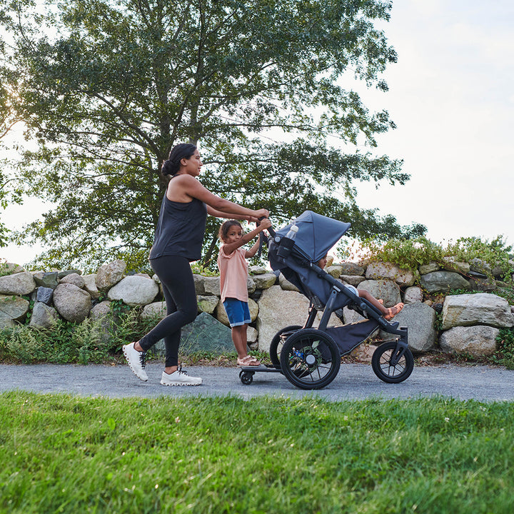 The UPPAbaby RIDGE PiggyBack is a great addition for growing families, as your one-child stroller can now carry two! Though you won't be able to go on a run with this attachment, the PiggyBack will provide a fun and safe ride for your older child.