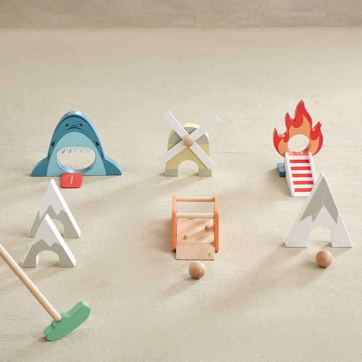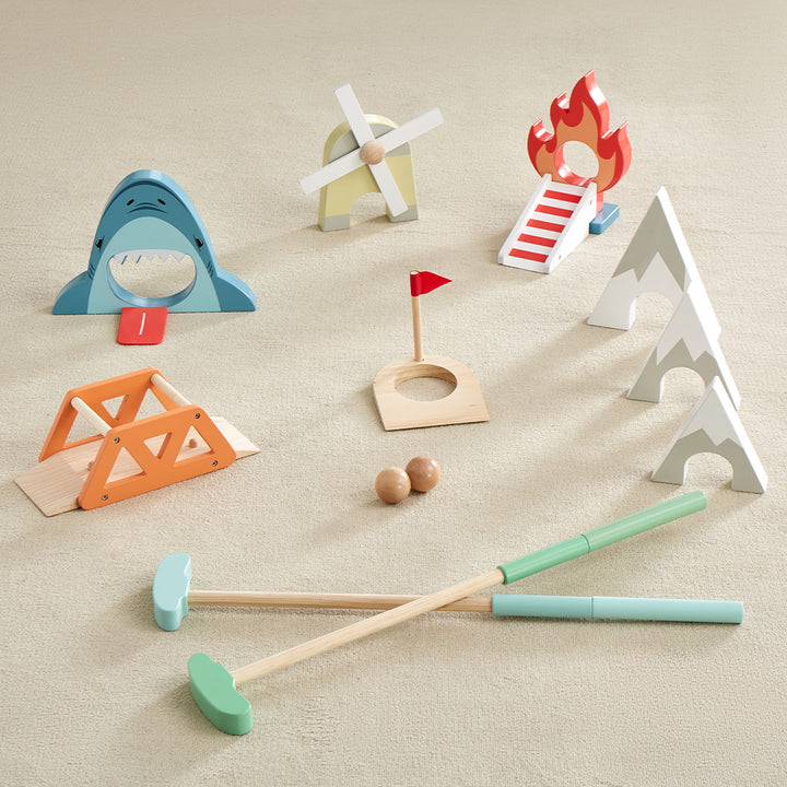 - The 8-piece set includes a shark, 3-sized mountains, flame and ramp, bridge, windmill, and hole with a flag